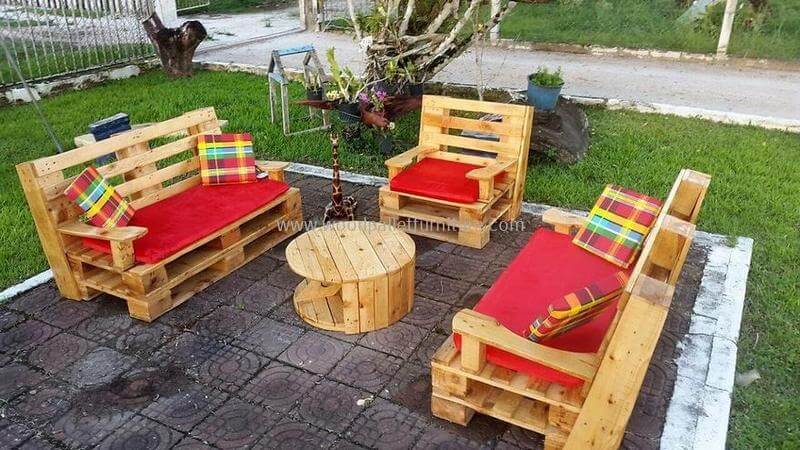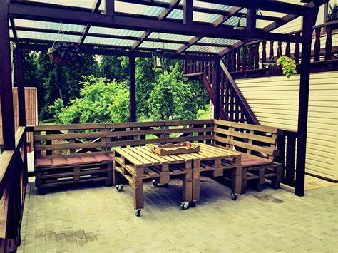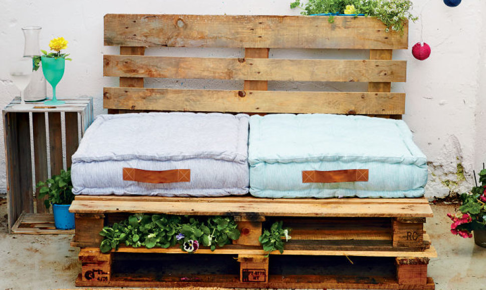 - Lauko baldai – iš palečių galima sukurti patogius ir stilingus sodo ar terasos baldus, tokius kaip stalai, suolai, sofos.